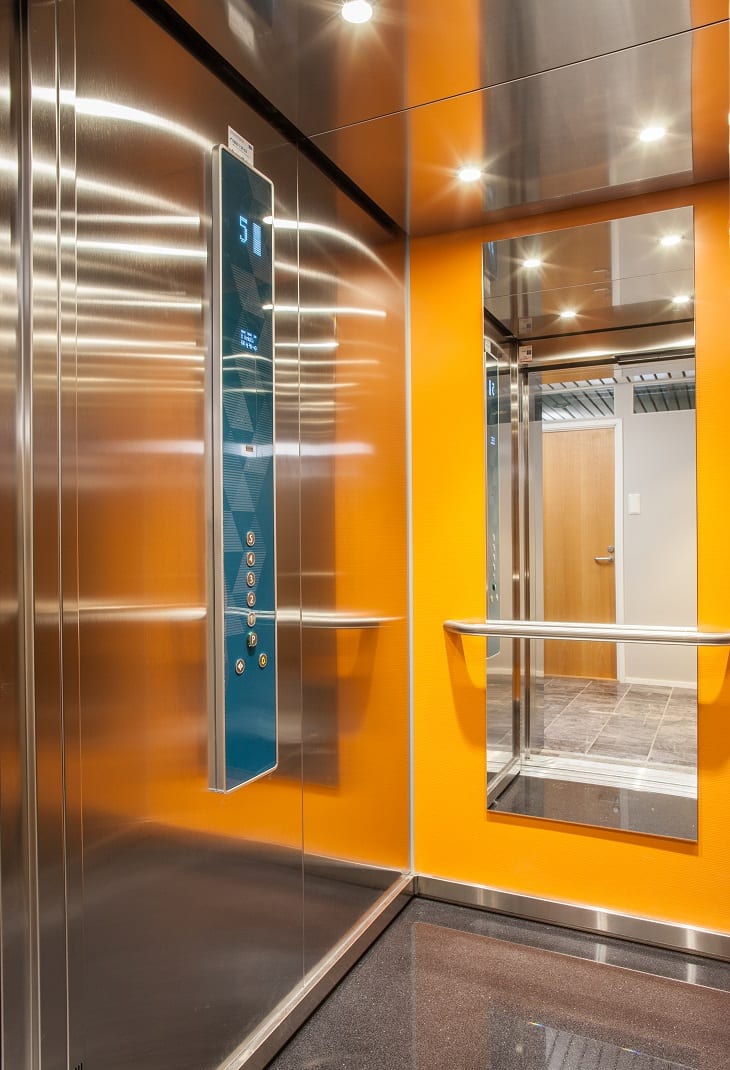 Hissi uusittiin kiinteistössä toimivan yrityksen brändiä kunnioittavasti. Yrityksen tunnusvärit - sininen ja oranssi - toistuvat hissin väri- ja materiaalivalinnoissa.
