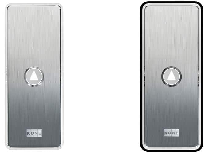 Esimerkki standardin EN 81-70:2018 kontrastivaatimuksesta (vasemmalla laite, joka ei vastaa vaatimuksia, oikealla vaatimusten mukainen laite).